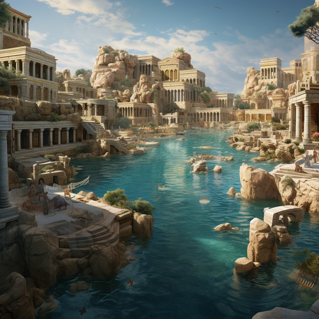 Assim, Posseidon dividiu Atlântida em zonas concêntricas de terra e água: – duas de terra e três de água cercando a ilha central, a qual era irrigada por uma fonte de água quente e outra de água fria. Com recursos naturais aparentemente inesgotáveis, os atlantes domesticaram animais selvagens, mineraram metais preciosos e destilaram perfumes. Também ergueram palácios, templos, canais e docas (parte abrigada do porto). A rede de canais unia várias partes do reino. “O continente contava com quatro aquedutos distribuídos igualmente pela ilha de forma que todas as regiões tivessem acesso às duas fontes (de água quente e fria). Era uma sociedade igualitária”, afirma Caldas. Havia lugares públicos para prática de exercícios físicos e banhos e ainda um estádio para corridas. Todas as ilhas eram cercadas por fortificações, em cujas baias aportavam os navios de todo o mundo então conhecido.