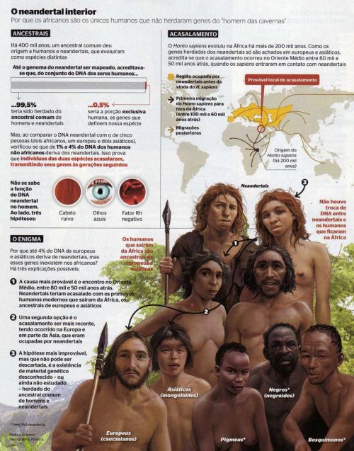 A contribuição genética neandertal não é universal. Os descendentes dos humanos que ficaram na África não se misturaram. Seu DNA não tem genes neandertais. Entender as causas que teriam levado os neandertais à extinção foi motivo de um debate acalorado que começou em 1856, quando seus primeiros fósseis foram retirados de uma caverna no Vale do Rio Neander, na Alemanha. Na época, o planeta estava partilhado pelas potências coloniais européias. Seus monarcas creditavam esse domínio à superioridade biológica, moral e tecnológica da civilização branca, cristã e européia. Identificar os neandertais como os ancestrais diretos dos europeus foi um passo imediato. Era a prova cabal de que o homem surgiu na Europa e, por isso, era superior aos asiáticos, aborígines e africanos. Não contavam com Charles Darwin.Em 1871, ao afirmar que chimpanzés e humanos evoluíram de um ancestral comum, Darwin apontou a África como o provável berço da humanidade. De uma hora para outra, os neandertais foram destituídos de sua primazia e rebaixados a primitivos “homens das cavernas”.