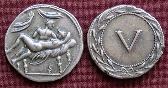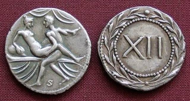 As moedas romanas com imagens sexuais são conhecidas como spintriae e eram cunhadas em bronze ou latão no primeiro século da Era Cristã. O propósito de tais moedas não é ainda definido com clareza, mas especula-se que elas eram utilizadas nos bordéis em lugar das moedas usuais – que costumavam ter efígies de governantes. As spintriae foram encontradas em diversos locais diferentes que fizeram parte dos domínios romanos, o que sugere que eram amplamente adotadas.