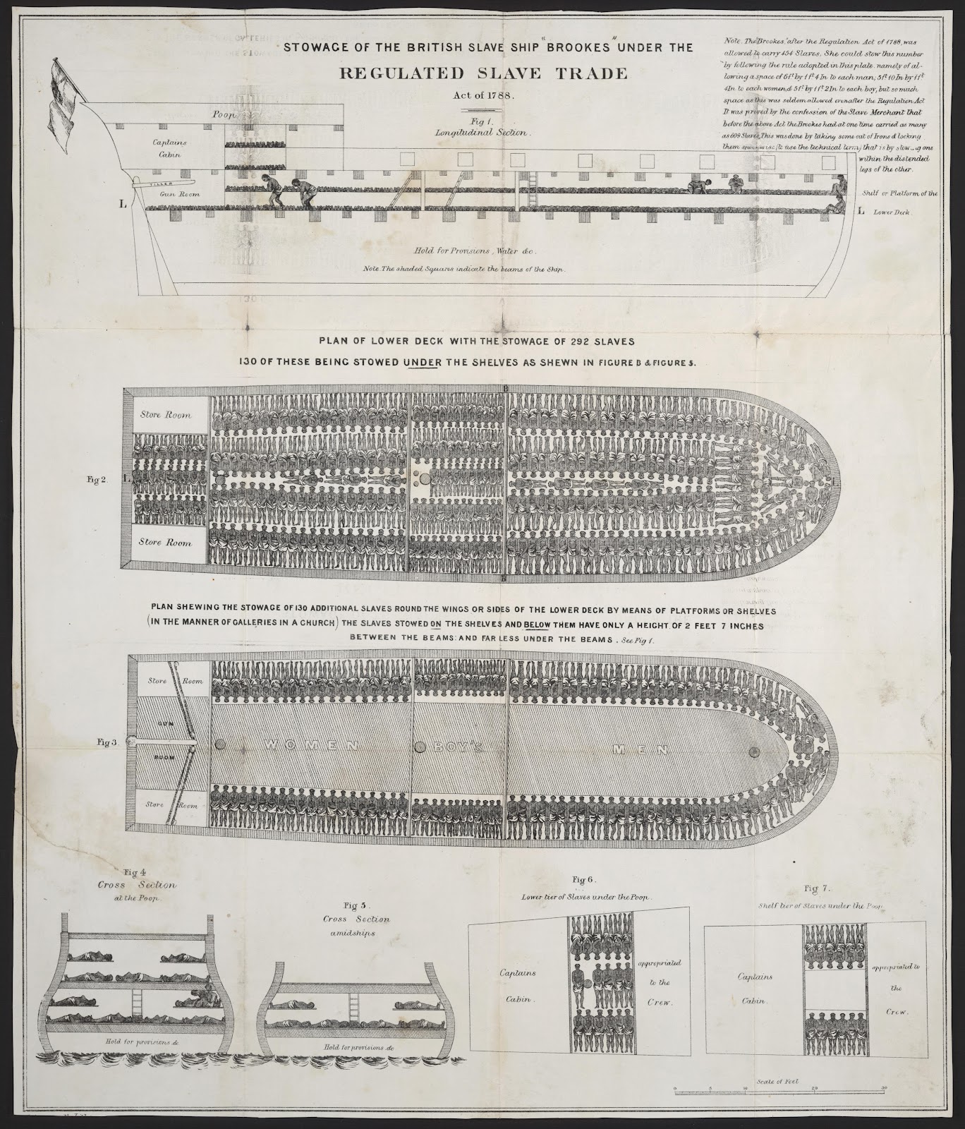 O navio negreiro britânico Brookes reproduzido em gravura de 1789. A imagem foi amplamente utilizada em campanhas abolicionistas nos EUA e é a mais famosa reprodução esquemática desse tipo de embarcação. Segundo o esquema, o navio comportava 450 escravos como “carga”, contudo costumava carregar regularmente entre 600 a 700 cativos em condições deploráveis.