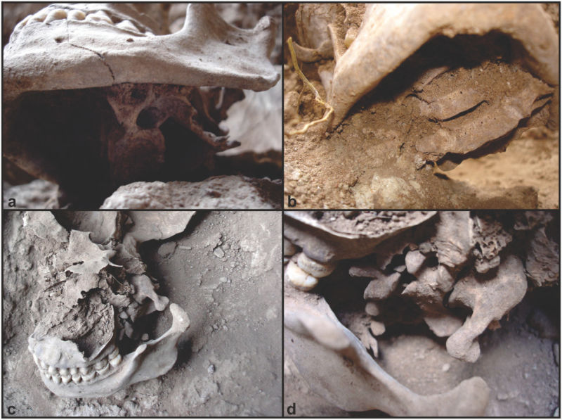 Há indícios de que a cabeça decepada não foi separada do corpo por um corte e sim por meio do ato de torcer e puxar até ocorrer a decapitação. Essa conclusão deve-se ao fato de que entre o grupo não eram utilizados instrumentos cortantes e muito menos produzidos por metais.