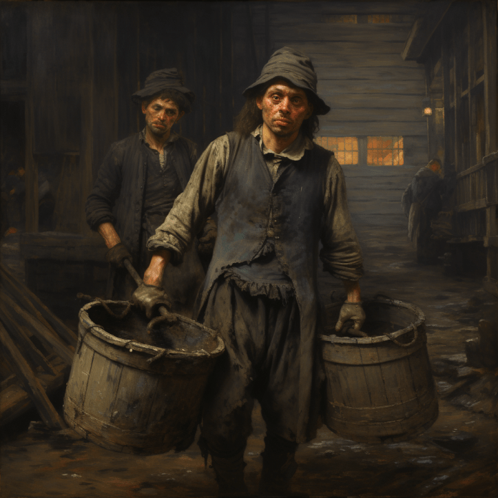 Entre os ingleses, por exemplo, este era um serviço noturno realizado por um verdadeiro esquadrão de trabalhadores que eram popularmente chamados de “homens da noite”, gente que carregava baldes e barris cheios de uma carga muito fedorenta transportados em carroças. Eles esvaziavam os recipientes domésticos, as fossas das vilas e cidades, limpavam calhas que escoavam fezes diretamente para os reservatórios apropriados e então transportavam o que juntavam para o local de descarte. Era um trabalho insalubre, repugnante, precário, pessimamente remunerado e estigmatizado, pois seus praticantes não tinham reconhecimento social muito positivo. E mesmo com os esforços desses trabalhadores as cidades estavam longe de ser consideradas minimamente limpas, pois era comum encontrar cocô humano nas ruas misturado com fezes de animais, além de urina que era simplesmente despejada em qualquer lugar ou mesmo jogada das janelas frequentemente molhando os transeuntes.