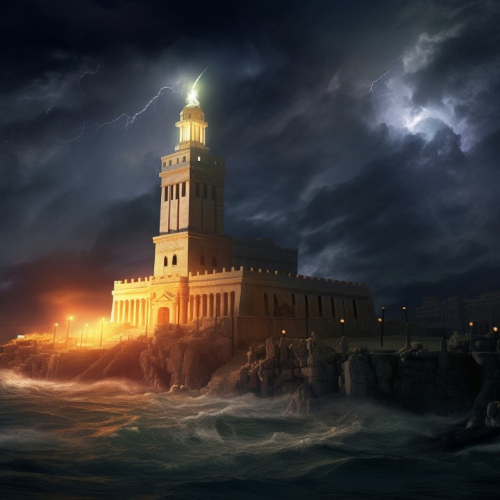 Também conhecido como Farol de Faros, foi construído entre 280 e 247 a.C. na ilha de Faros, próximo à cidade de Alexandria. Com cerca de 130 metros de altura, era uma das estruturas mais altas do mundo antigo e servia como um farol e ponto de referência para os navegantes.