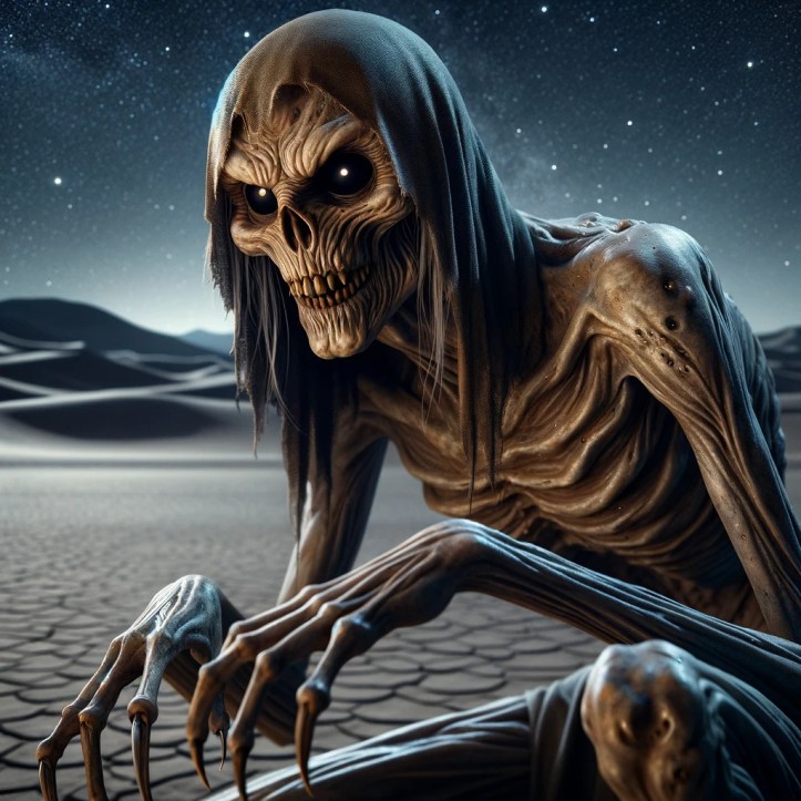 Na mitologia árabe, os ghouls são demônios ou espíritos malignos que habitam lugares desolados como cemitérios e desertos. Eles são conhecidos por desenterrar corpos e devorar carne humana, muitas vezes assumindo a forma de suas vítimas.