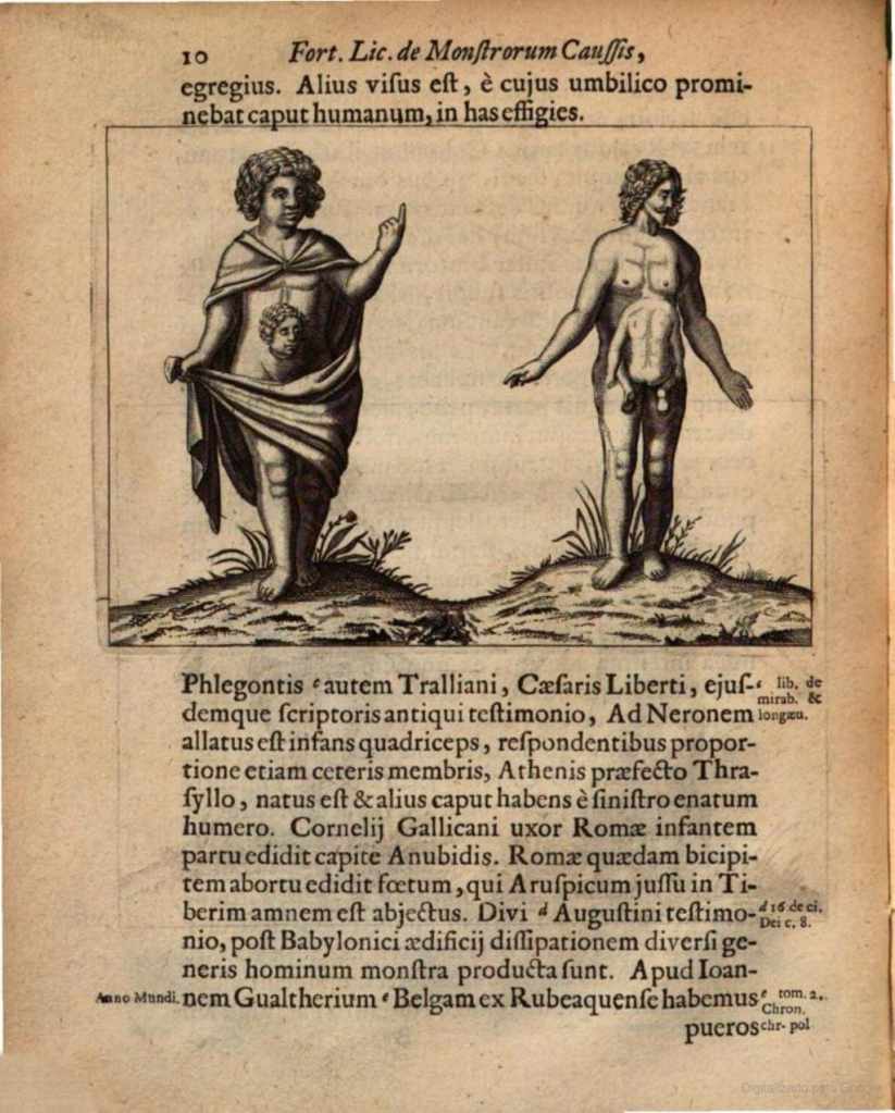 As anormalidades retratadas correspondiam a variadas situações, incluindo ocorrências de tipos distintos de siameses, gêmeos parasitas e até criaturas mutantes, pois os limites entre ciência e fantasia não estavam firmemente definidos no trabalho de Liceti. Ele descreveu o que seriam possibilidades de anomalias híbridas, de humanos com partes de corpos de variados animais, simbiontes complexos e criaturas tão estranhas que apenas a ficção científica seria capaz de apresentar muito tempo depois.