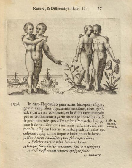 As anormalidades retratadas correspondiam a variadas situações, incluindo ocorrências de tipos distintos de siameses, gêmeos parasitas e até criaturas mutantes, pois os limites entre ciência e fantasia não estavam firmemente definidos no trabalho de Liceti. Ele descreveu o que seriam possibilidades de anomalias híbridas, de humanos com partes de corpos de variados animais, simbiontes complexos e criaturas tão estranhas que apenas a ficção científica seria capaz de apresentar muito tempo depois.