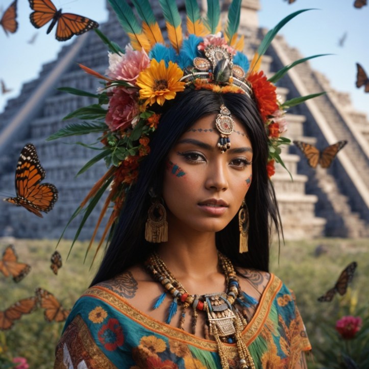 A representação de Xochiquetzal na mitologia asteca era uma fusão de beleza celestial e terrena, simbolizando o ideal de feminilidade e a essência da criação artística. Ela era frequentemente retratada como uma jovem de radiante beleza, adornada com flores vibrantes e plumas de quetzal, que eram altamente valorizadas na sociedade asteca por sua rara beleza. Sua imagem é repleta de simbolismo: flores representando a fragilidade e efemeridade da vida, as plumas simbolizando a elevação espiritual, e sua juventude eterna refletindo o ciclo constante de renovação e fertilidade.
